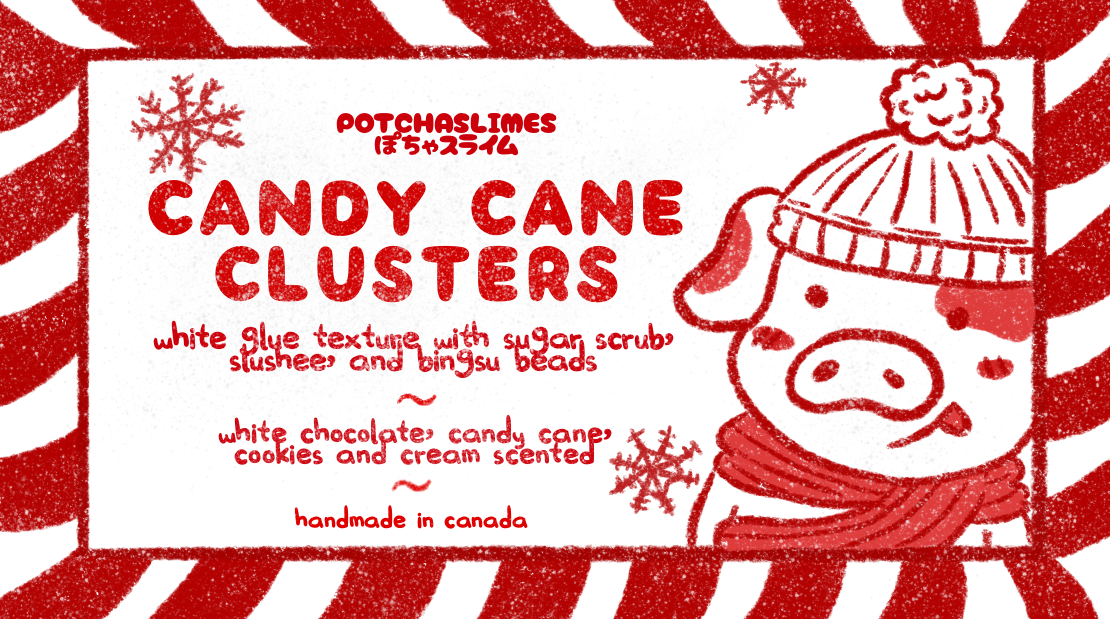 CANDY CANE CLUSTERS is a seasonal holiday exclusive limited edition slime. This slime has a white glue bingsu, slushee, and sugar scrub texture and is scented a hand blend of candy canes, creamy milky white chocolate, and cookies and creme. It smells like a delicious chocolate treat! It comes with various candy cane add-ins.