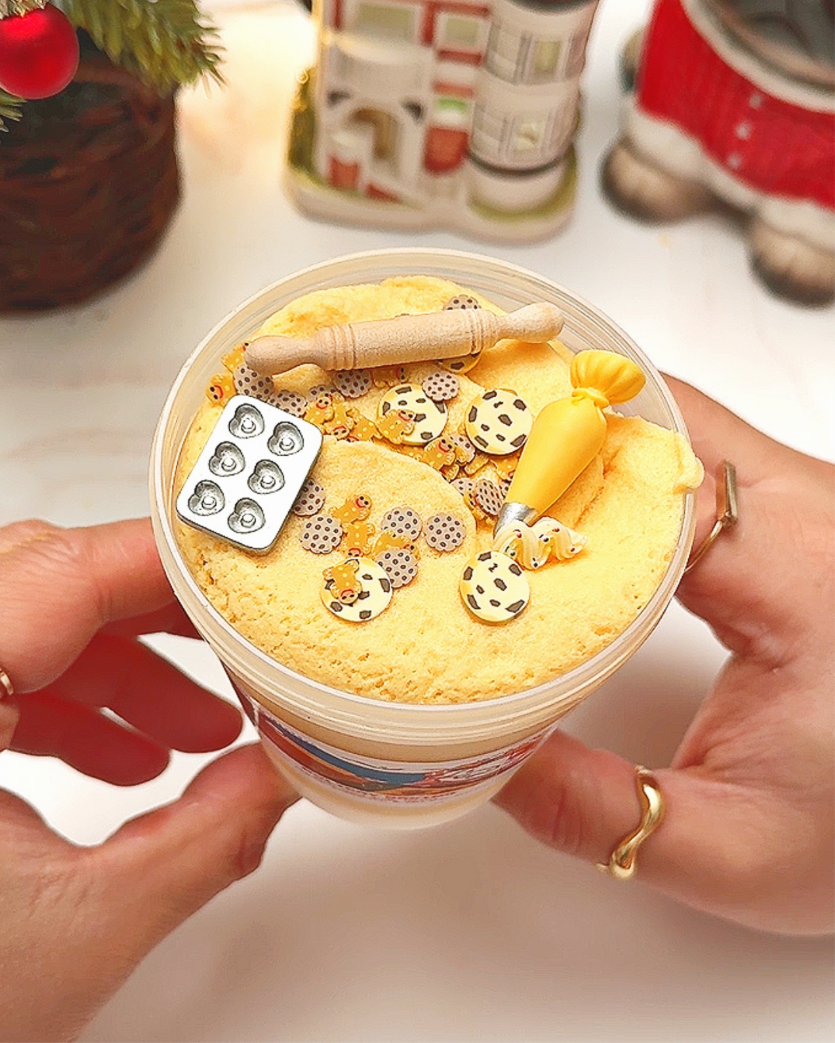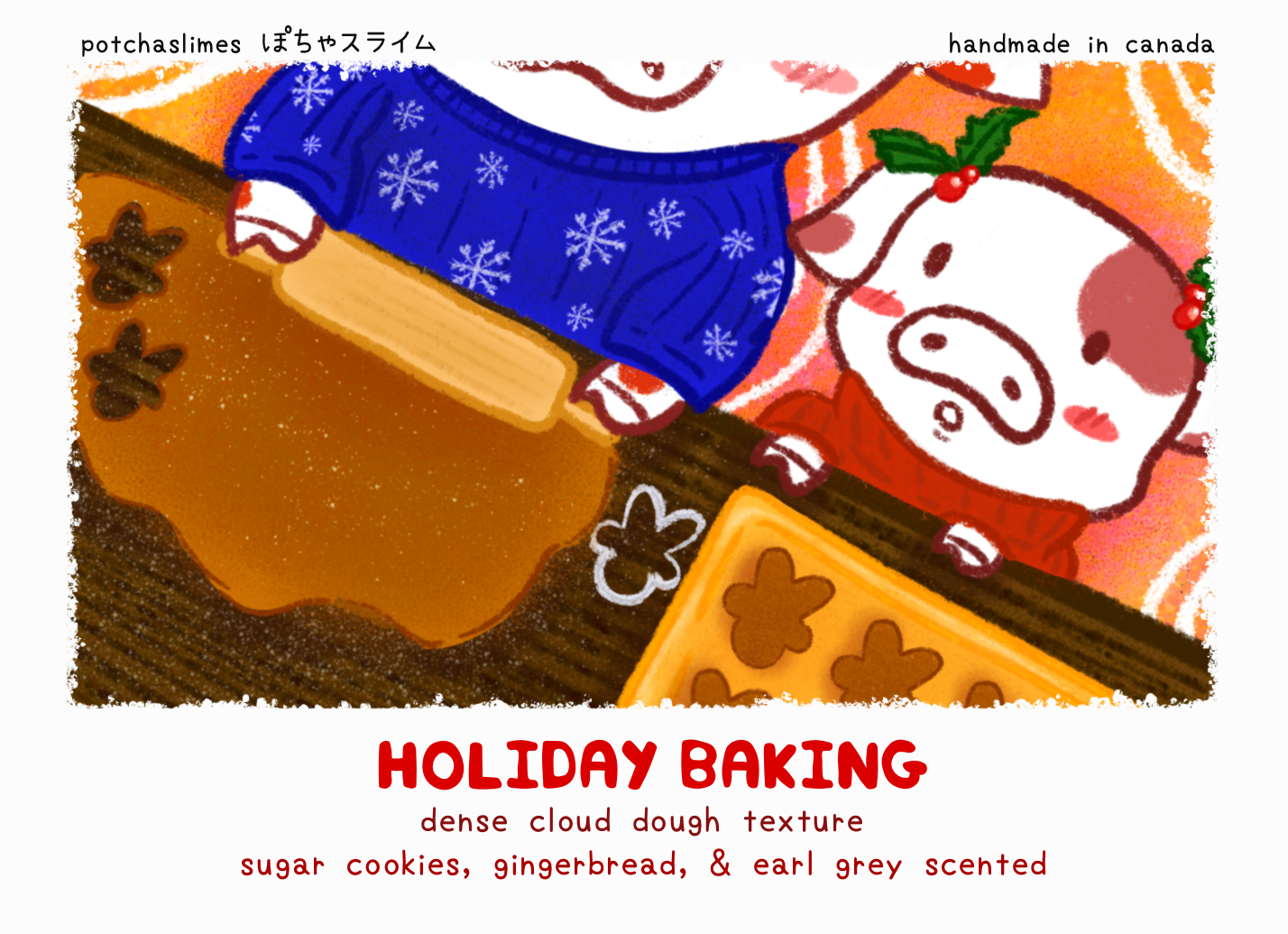 HOLIDAY BAKING is a seasonal holiday exclusive limited edition slime. This slime is inspired by holiday baking sessions! The texture is a dense cloud dough with a mix of different clays. It is plush, sizzly, and quiet, making it perfect for desk play while working. It is scented a blend of gingerbread cookies, sugar cookies, and earl grey tea. It comes with an icing bag charm, rolling pin charm, and cookie tray charm with cookie fimos.