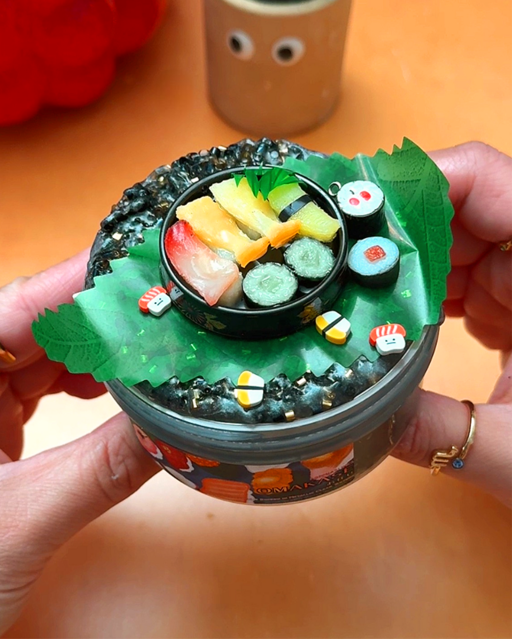 Each slime comes with a random deluxe sushi charm, two sushi roll charms, a plastic leaf, and nigiri sushi fimos. As such, the price is higher due to the intricacy of this slime.