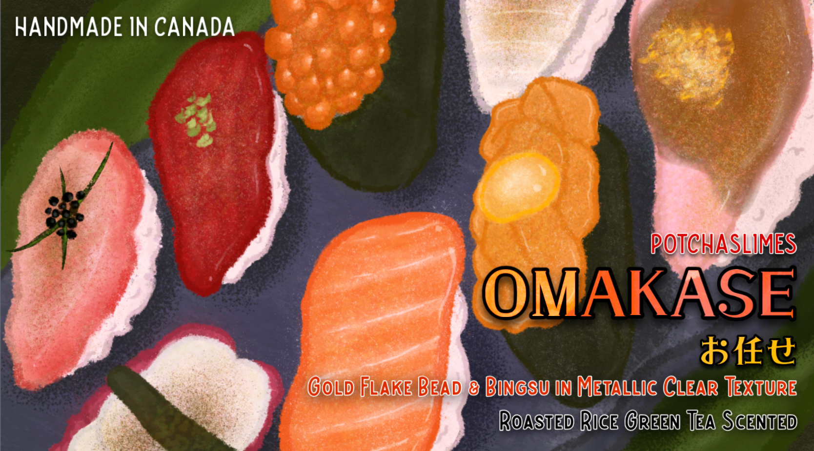 OMAKASE is a thick metallic clear slime with gold rock flake beads and bingsu beads. The rock flakes do not hurt the hands and with the base, it is cushioned to protect your hands. The aesthetic of this slime, which is metallic dark grey and gold  matches the opulence of omakase meals which tend to be on the more luxury side. As well, some omakase meals have been served on stone slabs.