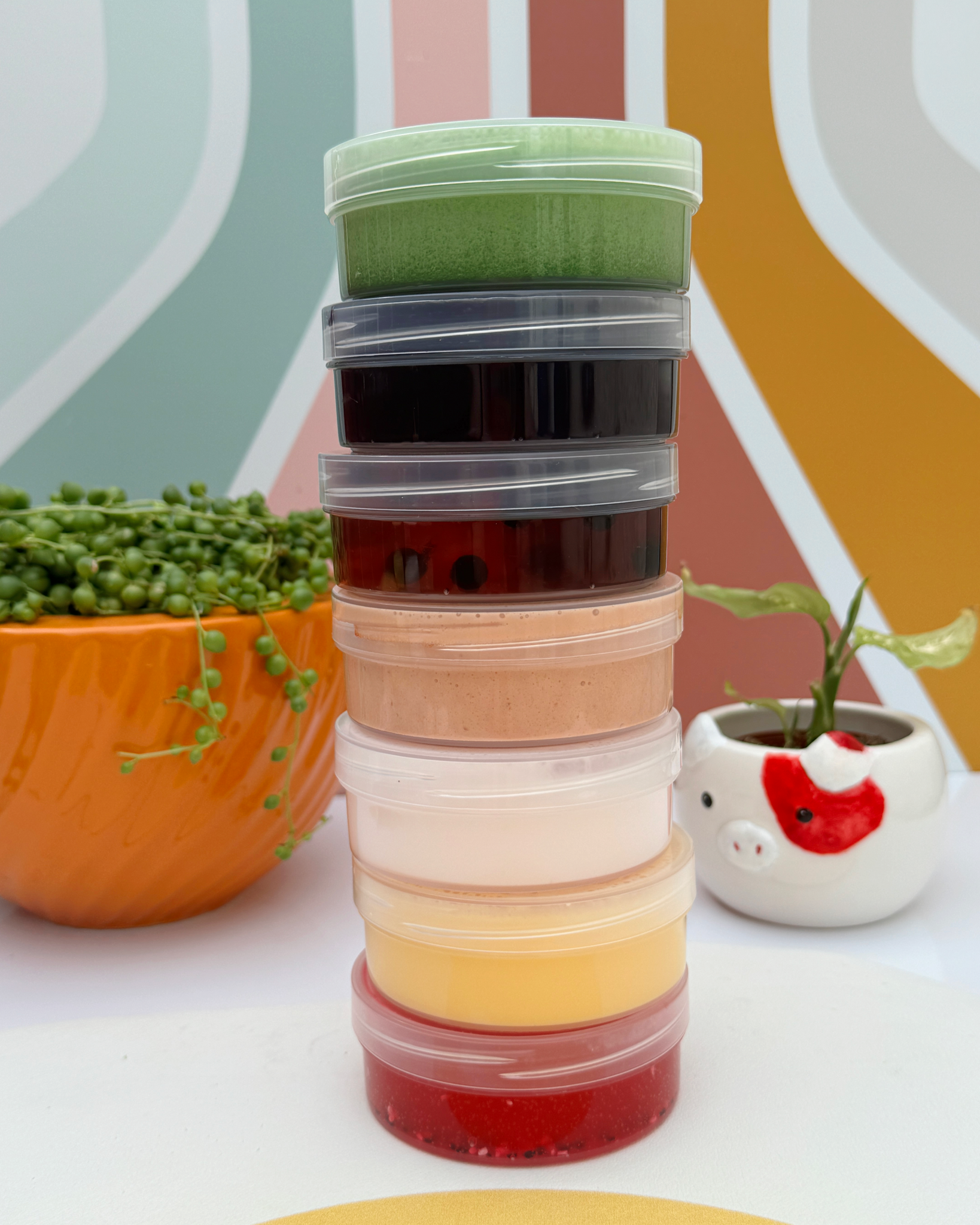 The BOBA SLIMES BUNDLE is a bundle of 7 different slimes from our May 31 "Boba" restock, in cute 5 oz sizes! If you want to try different scents and textures from our shop, we highly recommend it.