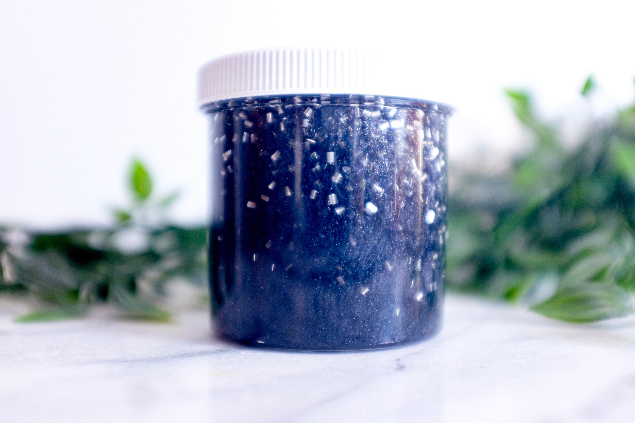 This slime is Galina, based off of the mineral of the same name. This slime features a black clear base and is loaded with silver bingsu beads. It is scented like avocado and sea salt.