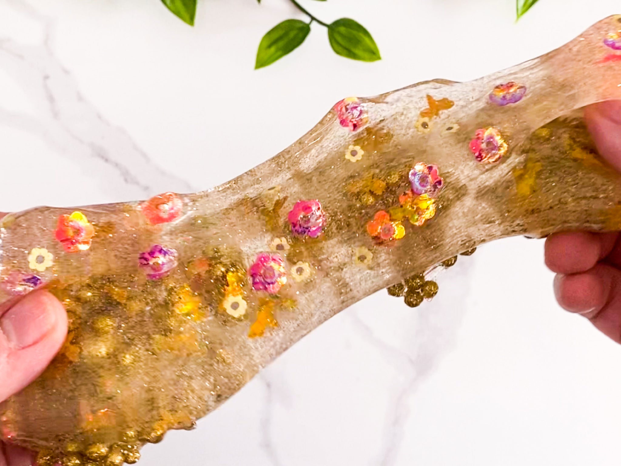 Please note, the large foam beads may fall out with aggressive play. Also, due to cold weather, the water jelly slime may be a bit stiff with the floam. Allow to sit near a heat source for a short period of time.