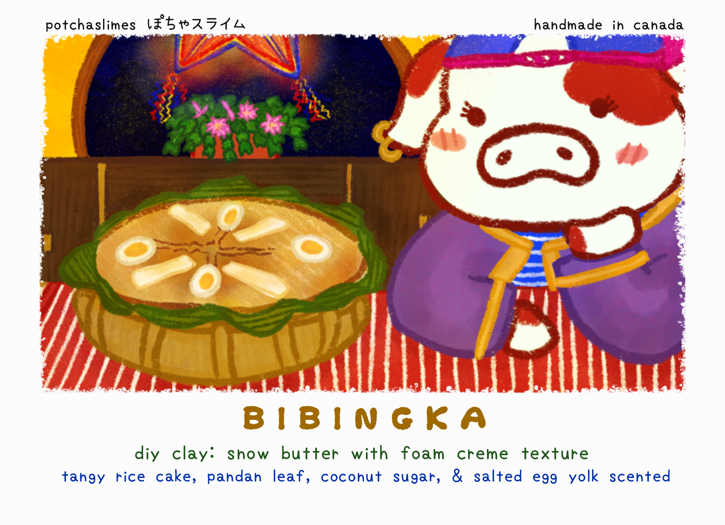 BIBINGKA is inspired by the Filipino dessert, bibingka, which is made of rice flour and topped with salted eggs and sweet cheese and is baked in a banana leaf, resulting in a unique taste. It commonly eaten on Christmas eve or Christmas season.  This slime is a fluffy snow butter texture scented rice cakes with slight tanginess, salted egg yolk, pandan leaf, and sweet cheese. It is Southeast Asia in a slime! This slime comes with clay toppings to resemble a bibingka.